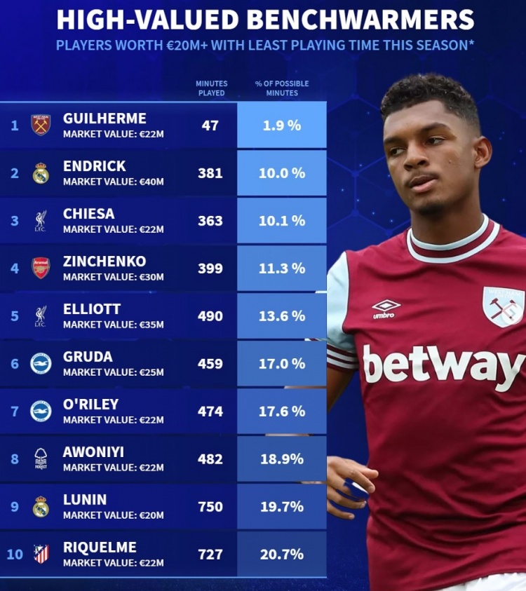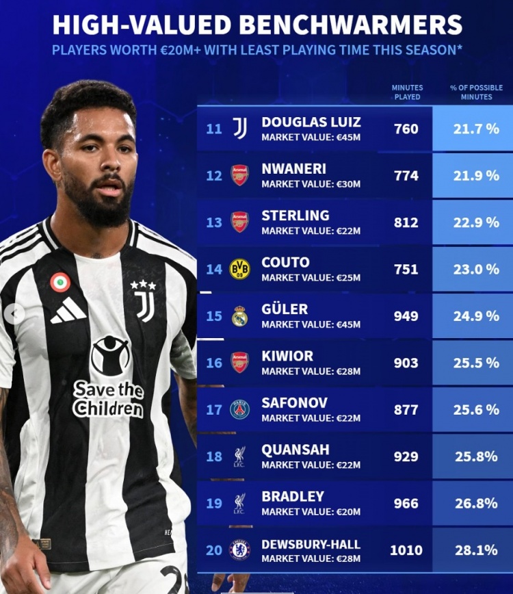 2月18日訊 《轉(zhuǎn)會(huì)市場(chǎng)》統(tǒng)計(jì)了本賽季身價(jià)2000萬(wàn)歐元以上球員的出場(chǎng)時(shí)間情況,并列出了冷板凳榜單。