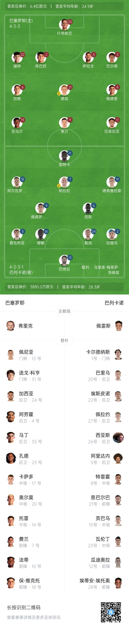 巴薩首發(fā):25-什琴斯尼、2-庫(kù)巴西、5-伊尼戈-馬丁內(nèi)斯、3-巴爾德、32-??送?福特、6-加維、21-德容、8-佩德里、11-拉菲尼亞、19-亞馬爾、9-萊萬多夫斯基