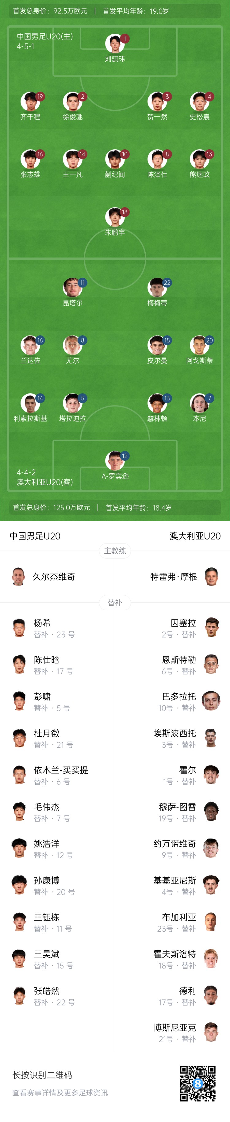 2月18日訊 北京時(shí)間19點(diǎn)30分,U20亞洲杯小組賽A組第三輪,中國(guó)vs澳大利亞,賽前雙方首發(fā)公布!本場(chǎng)比賽劉誠(chéng)宇因累積黃牌停賽,較上場(chǎng)比賽國(guó)青首發(fā)更換6人,澳大利亞則更換了9人。