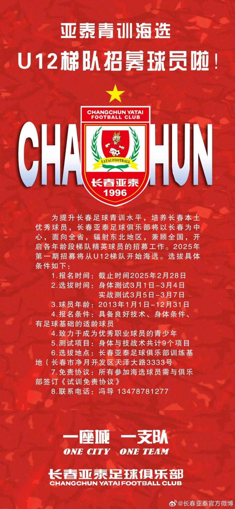 為了可持續(xù)發(fā)展戰(zhàn)略,完善俱樂部梯隊(duì)建設(shè),長(zhǎng)春亞泰足球俱樂部將立足本土,以長(zhǎng)春為中心,面向全省,輻射東北地區(qū),兼顧全國(guó),開啟各年齡段梯隊(duì)精英球員的招募工作。2025年第一期招募將從U12梯隊(duì)開始海選。