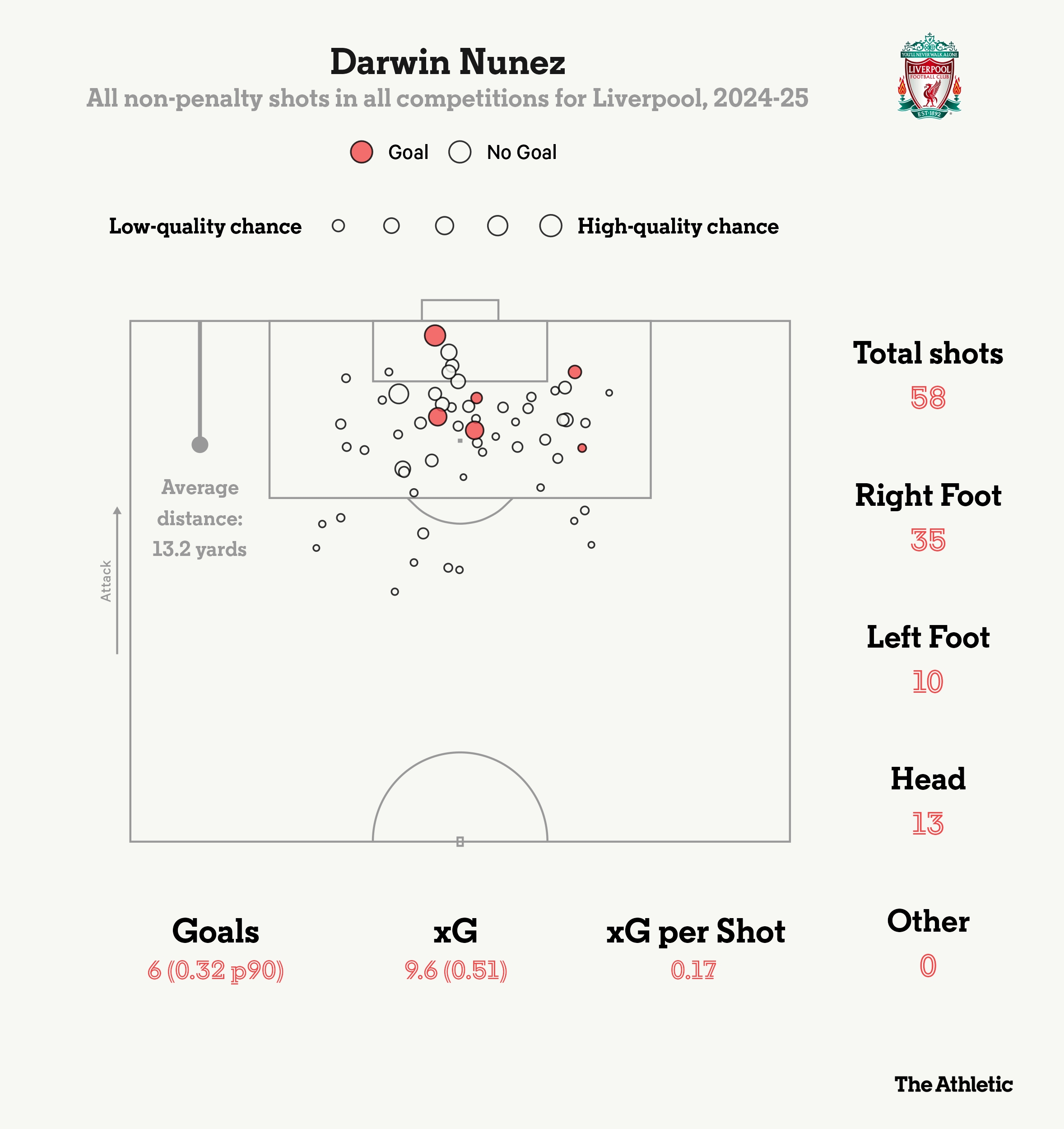 圓圈越大代表預(yù)期進(jìn)球越高努涅斯本賽季非點(diǎn)球射門射門數(shù)58次預(yù)期進(jìn)球9.6球實(shí)際進(jìn)球6球 本文標(biāo)簽: 足球 英超 利物浦