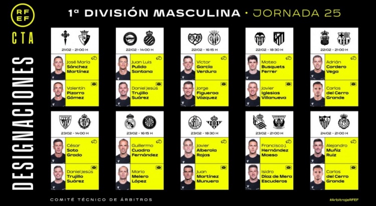 2月20日訊 本周末,西甲第25輪將全面打響,西班牙足協(xié)官方公布了本輪比賽的裁判安排,維加執(zhí)法巴薩客戰(zhàn)拉斯帕爾馬斯,夸德拉-費爾南德斯主裁皇馬對陣赫羅納。