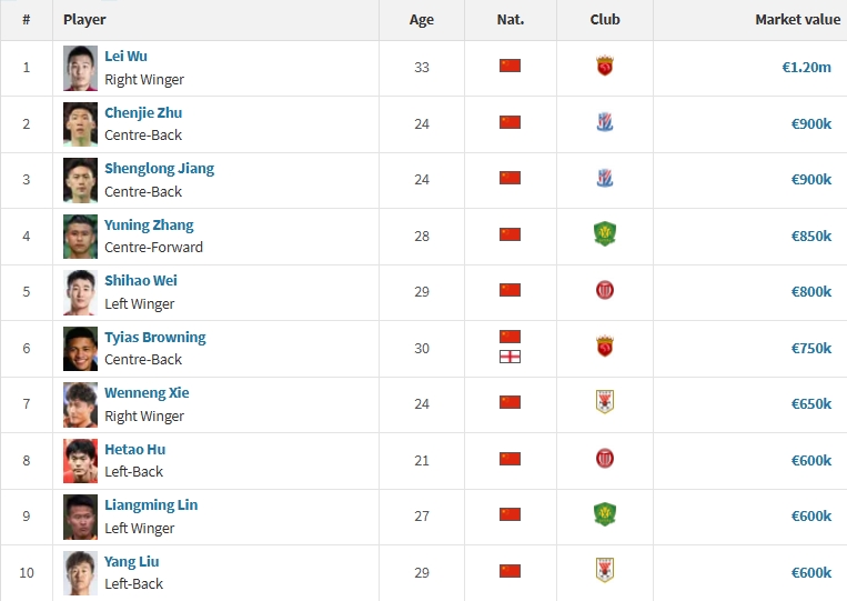 中國(guó)籍球員身價(jià)排行前十(單位:歐元):
