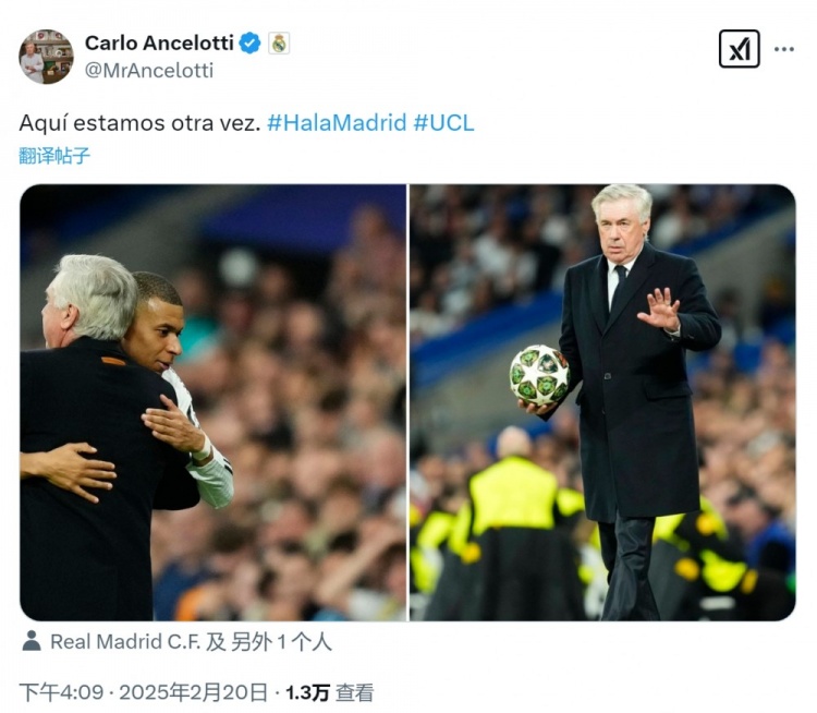 2月20日訊 歐冠淘汰賽附加賽次回合比賽,姆巴佩上演帽子戲法,幫助皇馬主場3-1擊敗曼城,兩回合總比分6-3晉級16強(qiáng)。皇馬主帥安切洛蒂更新社媒動態(tài),曬出與姆巴佩擁抱的照片,配文:“我們又來了,Hala Madrid!”歐冠16強(qiáng)抽簽將在北京時間明天19點(diǎn)進(jìn)行,皇馬的對手將是馬競或勒沃庫森。 本文標(biāo)簽: 足球 西甲 皇家馬德里 歐冠 安切洛蒂