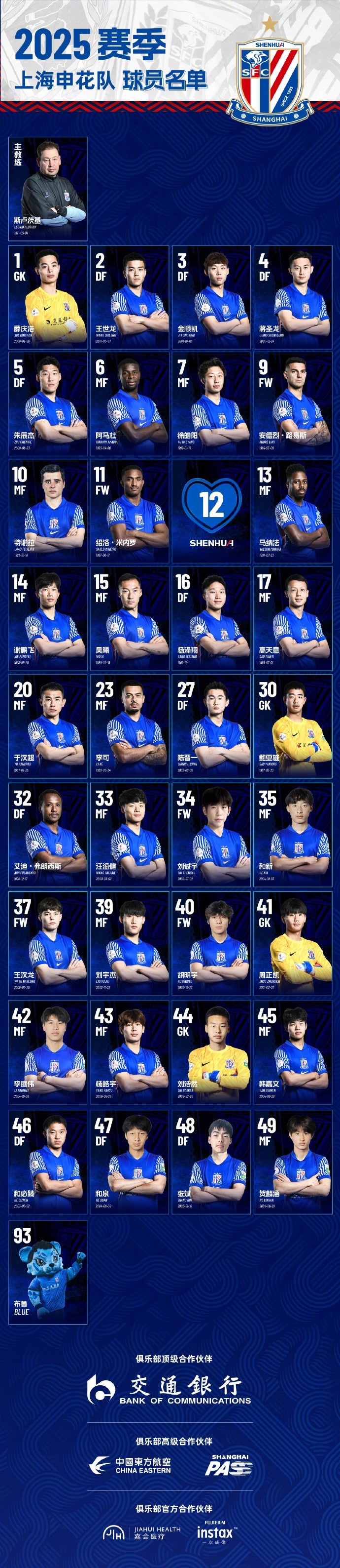 申花2025賽季球員名單:5外援領(lǐng)銜,吳曦、于漢超、劉誠宇在列