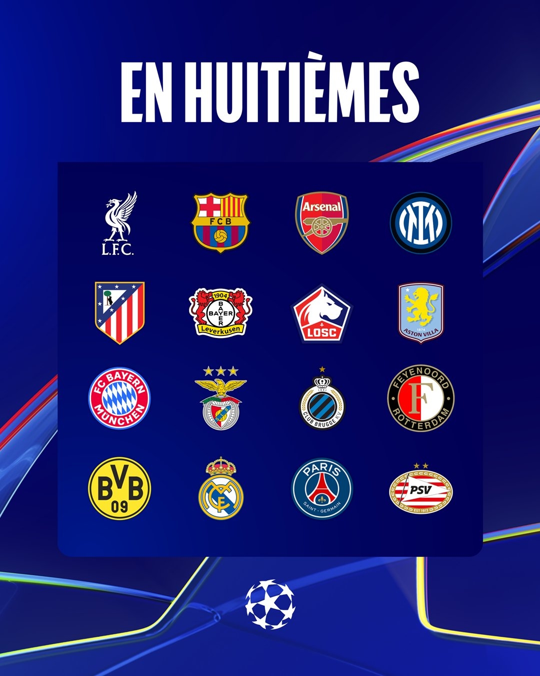 附加賽晉級8隊:本菲卡、拜仁慕尼黑、費耶諾德、布魯日、多特蒙德、巴黎圣日耳曼、皇家馬德里、埃因霍溫