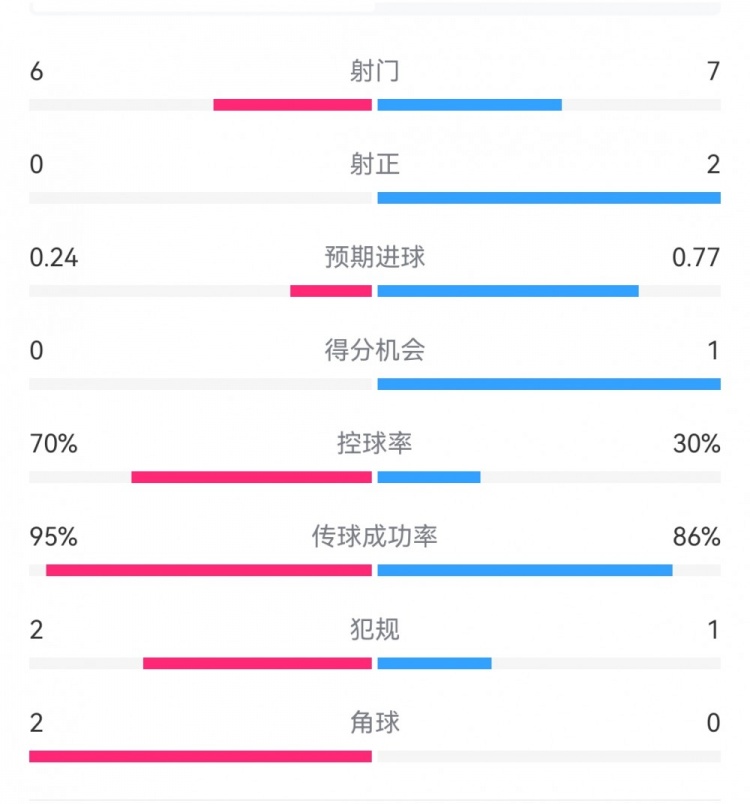 1月30日訊 歐冠末輪,曼城半場(chǎng)0-1落后布魯日,若不勝曼城將被淘汰。雙方半場(chǎng)重點(diǎn)數(shù)據(jù)對(duì)比如下↓(主隊(duì)曼城在前,客隊(duì)布魯日在后)