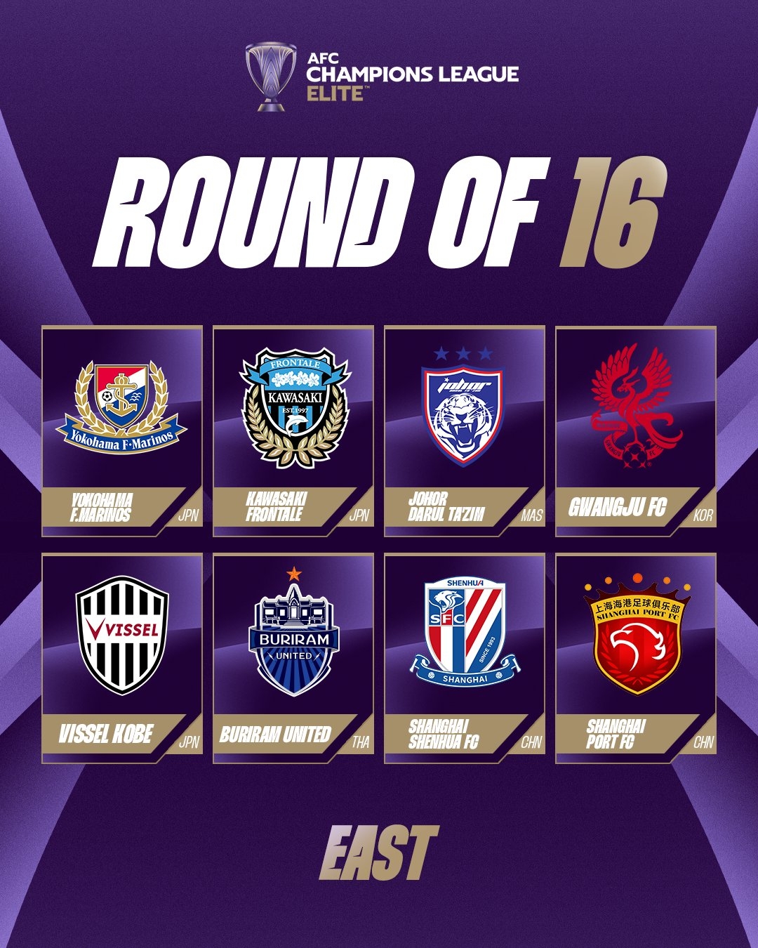 根據(jù)聯(lián)賽階段排名,東西亞分別進行1/8決賽,比賽為主客場雙回合制,角逐產(chǎn)生最終8支球隊參加決賽階段比賽。