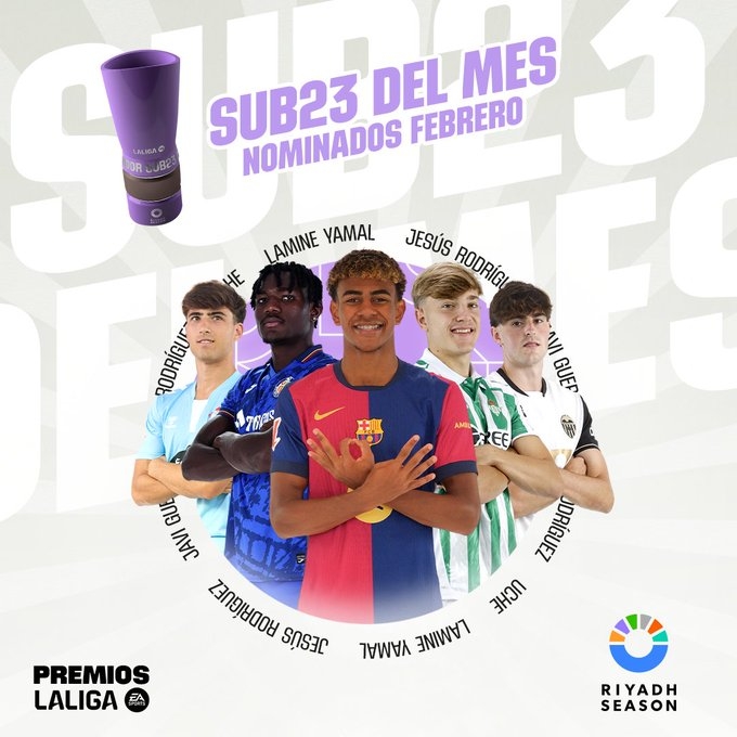 2月20日訊 西甲官方公布了2月最佳U23球員5人候選,17歲亞馬爾入選。亞馬爾(巴薩):3場(chǎng)0球0助烏切(赫塔費(fèi)):3場(chǎng)1球0助哈維-羅德里格斯(塞爾塔):3場(chǎng)1球0助熱蘇斯-羅德里格斯(貝蒂斯):3場(chǎng)0球0助哈維-格拉(瓦倫西亞):3場(chǎng)1球1助 本文標(biāo)簽: 足球 西甲 巴塞羅那 瓦倫西亞 塞爾塔 貝蒂斯 赫塔費(fèi)