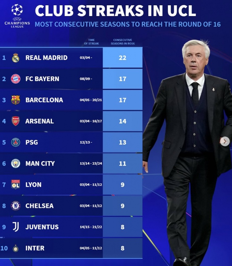 2月21日訊 皇馬在本輪歐冠附加賽雙殺曼城,成功挺進(jìn)歐冠十六強(qiáng)?!掇D(zhuǎn)會(huì)市場(chǎng)》也統(tǒng)計(jì)了歐冠歷史最長(zhǎng)連續(xù)晉級(jí)十六強(qiáng)榜單。