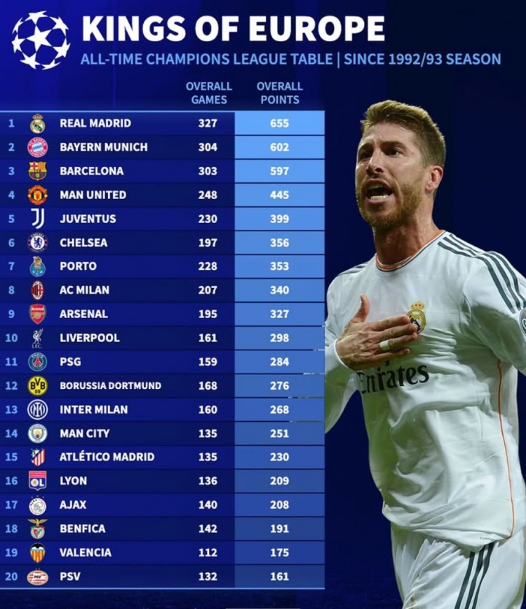 2月21日訊 歐冠淘汰賽附加賽已經(jīng)結(jié)束,《轉(zhuǎn)會(huì)市場(chǎng)》也統(tǒng)計(jì)了92-93賽季改制后的歐冠歷史積分榜,皇馬無懸念領(lǐng)跑。