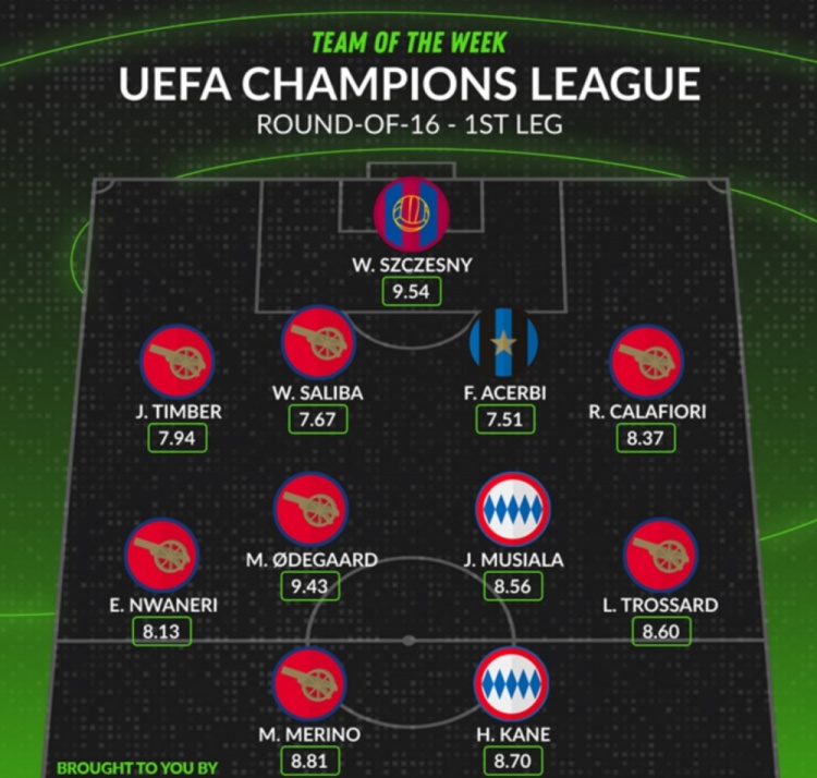 3月6日訊 數(shù)據(jù)網(wǎng)站W(wǎng)hoscored盤(pán)點(diǎn)了本輪歐冠評(píng)分最高陣容,其中取得7-1大勝的阿森納有7人入選,門將位置什琴斯尼力壓阿利森在列,具體陣容如下: