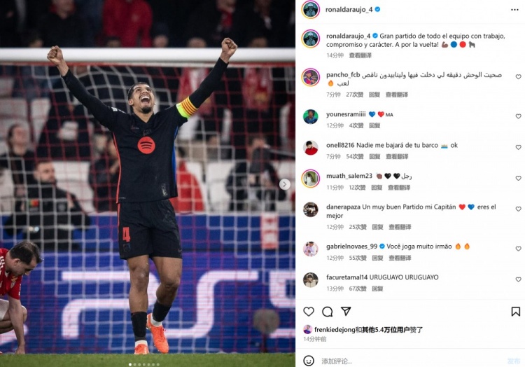 3月6日訊 在本輪歐冠,巴薩在長(zhǎng)時(shí)間10人作戰(zhàn)的不利局面下,最終1-0小勝本菲卡。隊(duì)長(zhǎng)阿勞霍也在個(gè)人社媒曬出仰天長(zhǎng)嘯慶祝照,配文寫(xiě)道:“全隊(duì)?wèi){借努力、決心以及意志踢出一場(chǎng)精彩的比賽,讓我們下一回合再來(lái)!” 本文標(biāo)簽: 足球 西甲 巴塞羅那