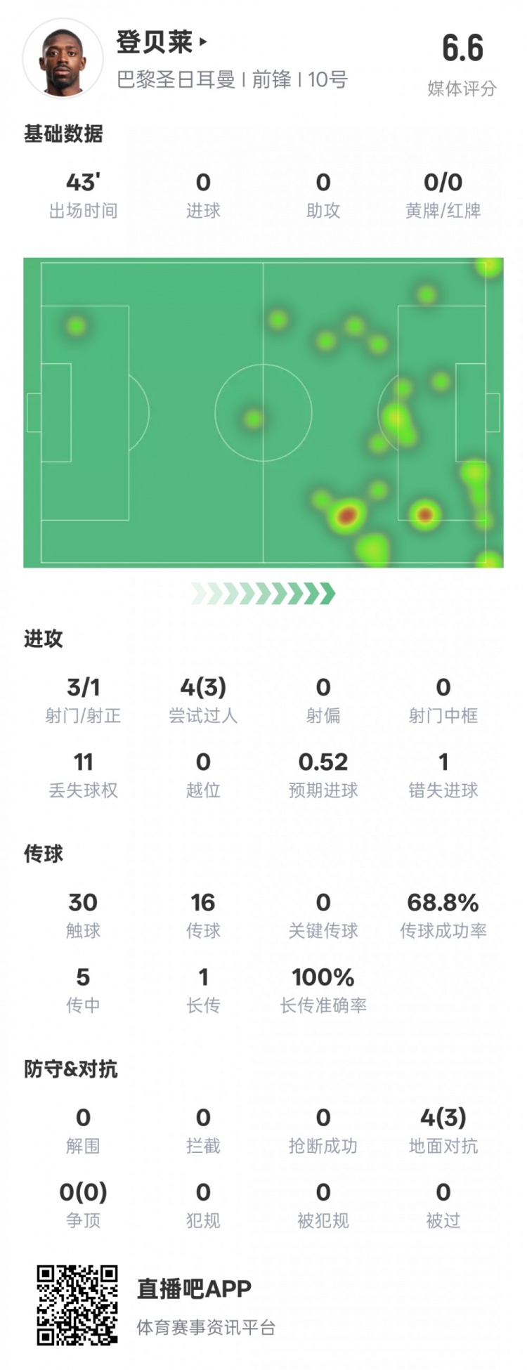 3月6日訊 歐冠1/8決賽次回合,巴黎半場暫0-0利物浦。登貝萊首發(fā)出戰(zhàn),4次過人3次成功,錯失1次進球機會,半場評分6.6。登貝萊半場數(shù)據(jù)如下:進球0助攻0射門3射正1過人4過人成功3丟失球權(quán)11錯失進球機會1觸球30傳球16傳球成功率68.8%傳中5長傳1長傳準確率100%地面對抗4地面對抗成功3 本文標簽: 足球 法甲 巴黎圣日耳曼 歐冠