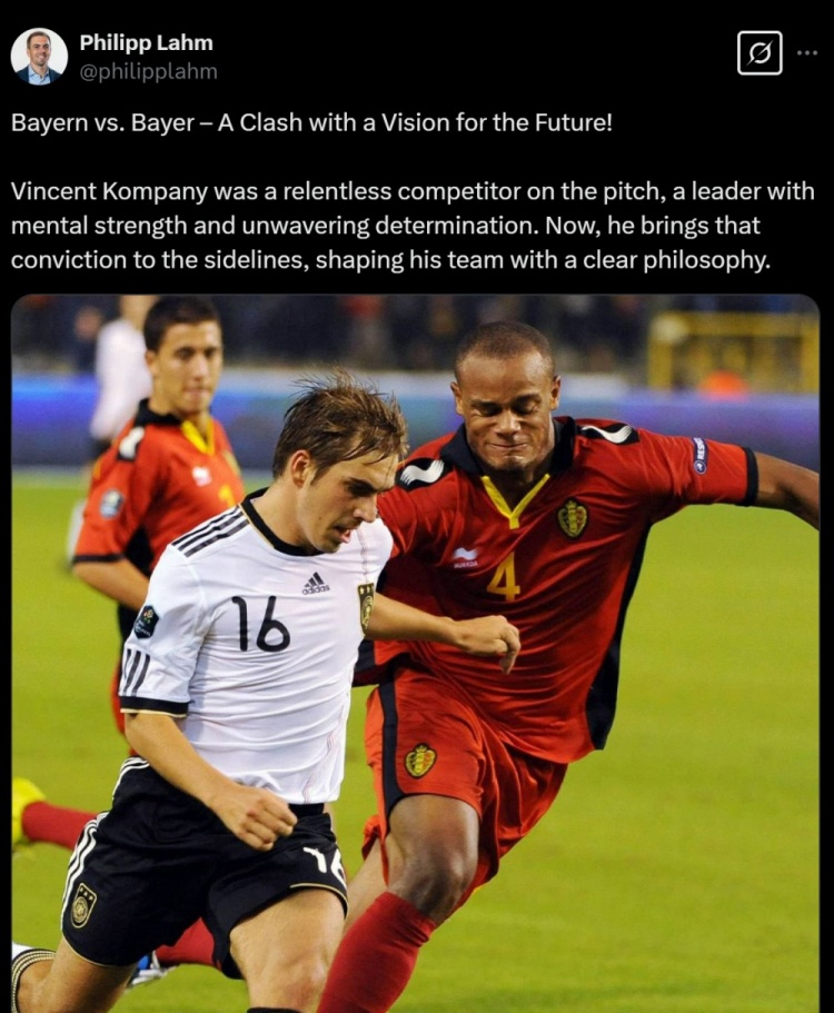 拉姆寫道:拜仁對陣?yán)瘴謳焐@是一場未來愿景之間的較量!在球場上,孔帕尼是一位不屈不撓的斗士,一位擁有強大精神力量和堅定決心的領(lǐng)袖?,F(xiàn)在,他將這種信念帶到了教練席,正在用清晰的理念塑造他的球隊。