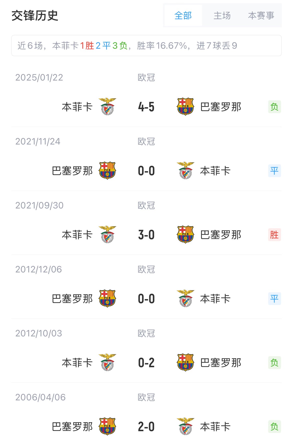 巴薩與本菲卡歷史共交手10次,巴薩4勝4平2負(fù)。兩隊本賽季歐冠聯(lián)賽階段同組,巴薩客場5-4絕殺本菲卡。