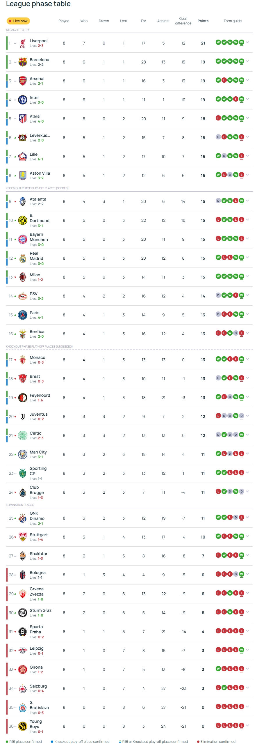 01月30日訊 歐冠聯(lián)賽階段末輪18場比賽同時開賽,實時積分情況如圖。 本文標(biāo)簽: 足球 英超 曼城 阿森納 利物浦 西甲 皇家馬德里 巴塞羅那 馬德里競技 意甲 AC米蘭 國際米蘭 尤文圖斯 亞特蘭大 德甲 拜仁慕尼黑 多特蒙德 勒沃庫森 斯圖加特 法甲 巴黎圣日耳曼 摩納哥 布雷斯特 阿斯頓維拉 赫羅納 里爾 五洲 荷甲 葡超 蘇超