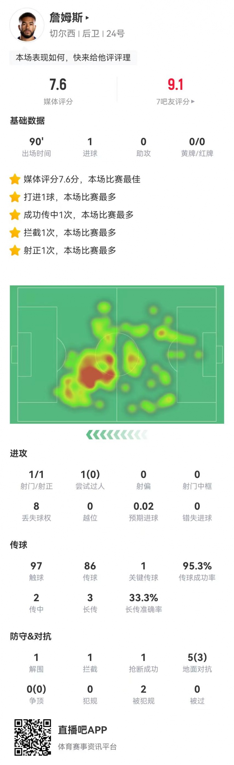3月7日訊 切爾西在本輪歐協(xié)聯(lián)2-1擊敗哥本哈根,里斯-詹姆斯客串后腰數(shù)據(jù)如下:首發(fā)踢滿全場1球97觸球86傳球、82成功,成功率95%1關(guān)鍵傳球2傳中、1成功3長傳、1成功1射門、1射正1過人、0成功5對抗、3成功8丟失球權(quán)2造犯規(guī)1搶斷1攔截1解圍獲評7.6分全場最高 本文標(biāo)簽: 足球 英超 切爾西