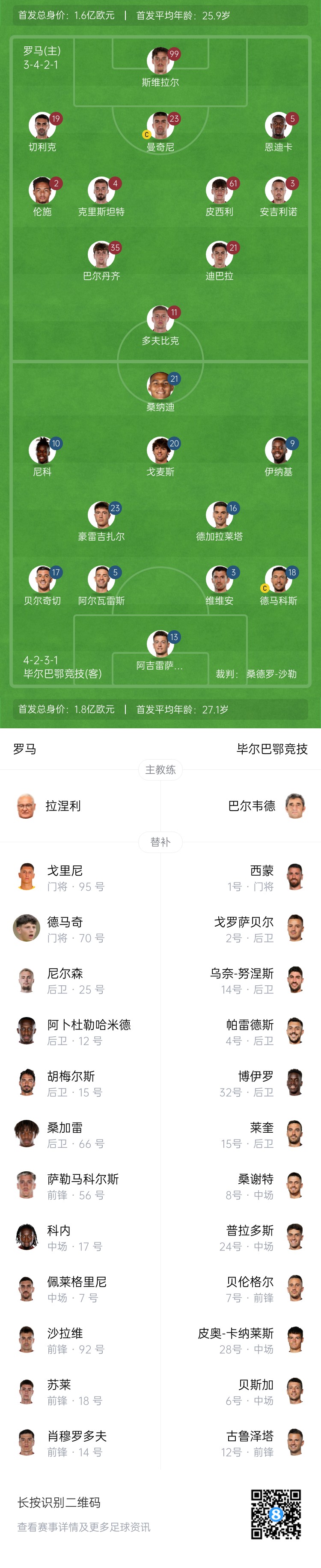 羅馬首發(fā):99-斯維拉爾、19-切利克、23-G-曼奇尼、5-恩迪卡、2-倫施、61-皮西利、4-克里斯坦特、3-安吉利諾、21-迪巴拉、35-巴爾丹齊、11-多夫比克