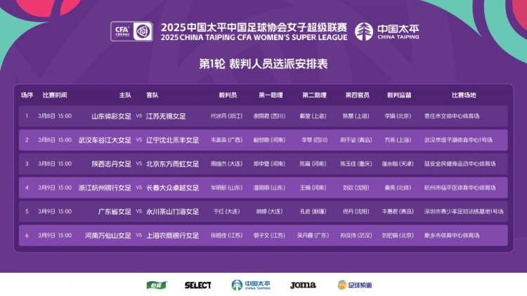 2025中國(guó)太平女超聯(lián)賽第1輪 裁判人員選派名單 ???