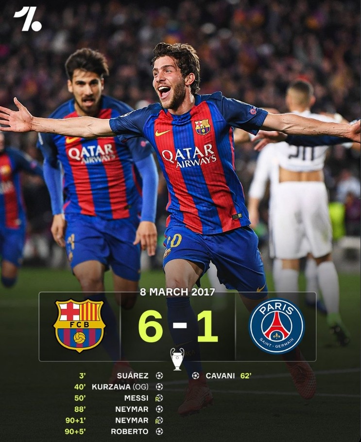 3月8日訊 在2017年的今天,巴薩在歐冠淘汰賽次回合以6-1大勝巴黎,成為歐冠歷史首支首回合0-4落后最終逆轉晉級的球隊。