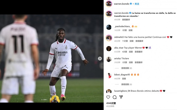 3月9日訊 米蘭在本輪意甲3-2逆轉(zhuǎn)擊敗萊切,冬窗新援邦多首發(fā)出戰(zhàn)。邦多在冬窗以1000萬歐元從蒙扎加盟后,因傷休戰(zhàn)至今,他也在本場比賽完成了米蘭首秀。邦多也在賽后通過社媒曬出自己的比賽照,并配文:“仇恨轉(zhuǎn)化為渴望,渴望轉(zhuǎn)化為成功”。 本文標(biāo)簽: 足球 意甲 AC米蘭 萊切
