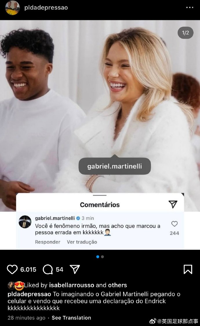 恩德里克在社媒曬自己與妻子Gabriely Miiranda的合影,但是卻把妻子標注成了阿森納球員加布里埃爾-馬丁內利。馬丁內利回復:“兄弟,你太厲害了!但我好像覺得你@ 錯人了????? 本文標簽: 足球 西甲 皇家馬德里