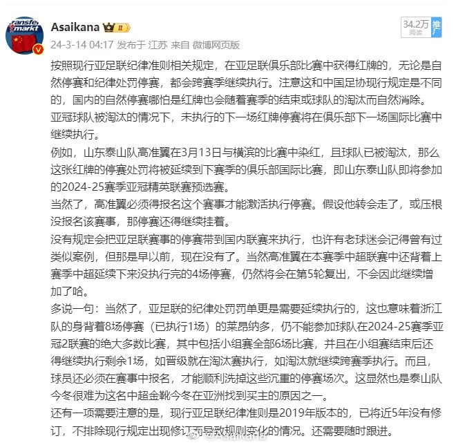 而亞足聯(lián)則相反,紅牌自然停賽需要跨賽季執(zhí)行。現(xiàn)中足聯(lián)和中國足協(xié)已經(jīng)分家,中足聯(lián)目前還是和中國足協(xié)保持一致,如果中足聯(lián)日后出臺與之不同的新的停賽執(zhí)行細則,職業(yè)聯(lián)賽范疇內(nèi)當然也是要以中足聯(lián)的規(guī)定為準。