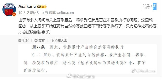 從2018賽季起,中國足協(xié)賽事的自然停賽隨賽季結(jié)束自動消除(此前是紅牌自然停賽或紀律處罰需要跨賽季)