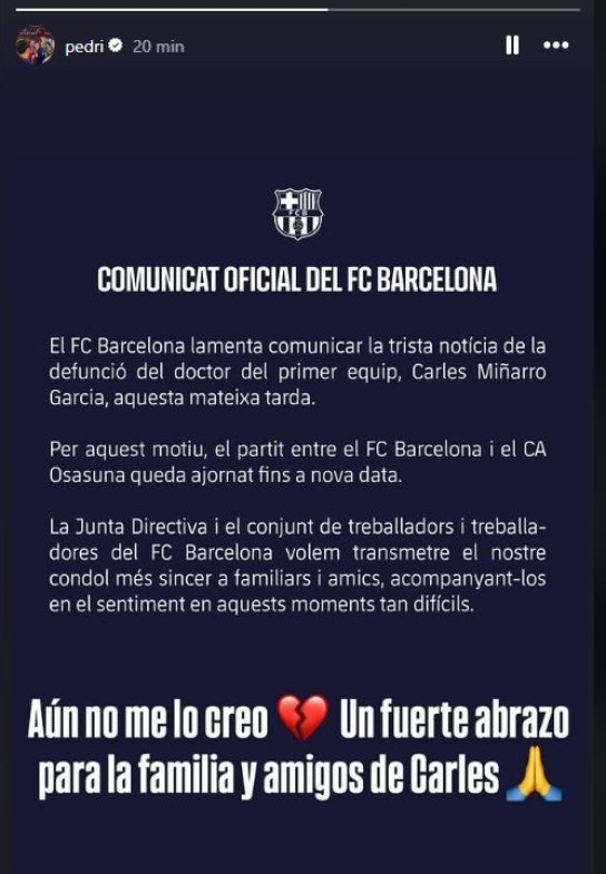 3月9日訊 今天凌晨,巴塞羅那俱樂部宣布一線隊(duì)隊(duì)醫(yī)卡萊斯-米尼亞羅-加西亞不幸離世,而球隊(duì)原定于北京時(shí)間凌晨4:00對陣奧薩蘇納的比賽也被推遲。