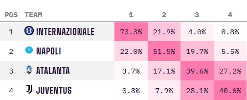 國(guó)米:73.3%;那不勒斯:22%;亞特蘭大:3.7%;尤文:0.8%