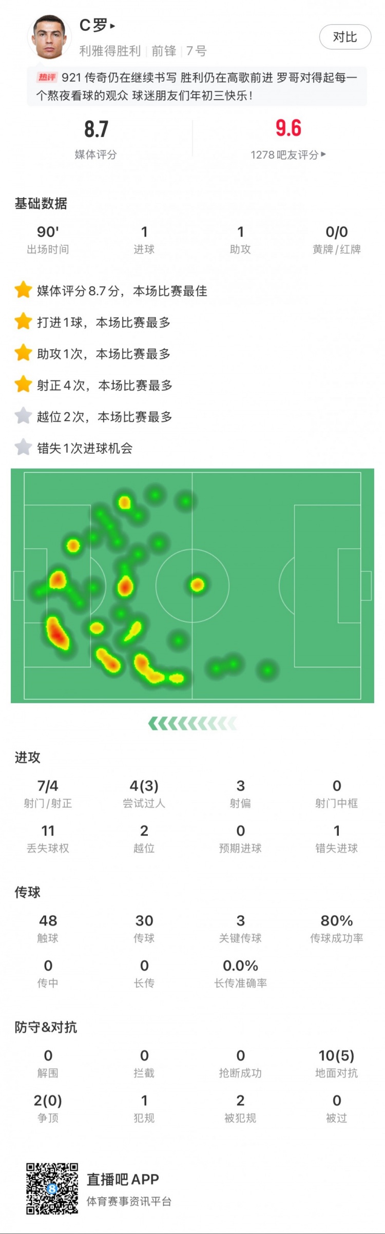1月31日訊 沙特聯(lián)第18輪,利雅得勝利客場2-1戰(zhàn)勝布賴代先鋒。C羅全場數(shù)據(jù):1球1助7次射門4次射正4次過人3次成功錯失1次得分機會48次觸球30次傳球24次成功3次關(guān)鍵傳球創(chuàng)造1次得分機會10次地面對抗贏得5次2次爭頂贏得0次11次丟失球權(quán)1次犯規(guī)2次被犯規(guī)2次越位媒體評分8.7全場最高 本文標(biāo)簽: 足球 C羅 利雅得勝利