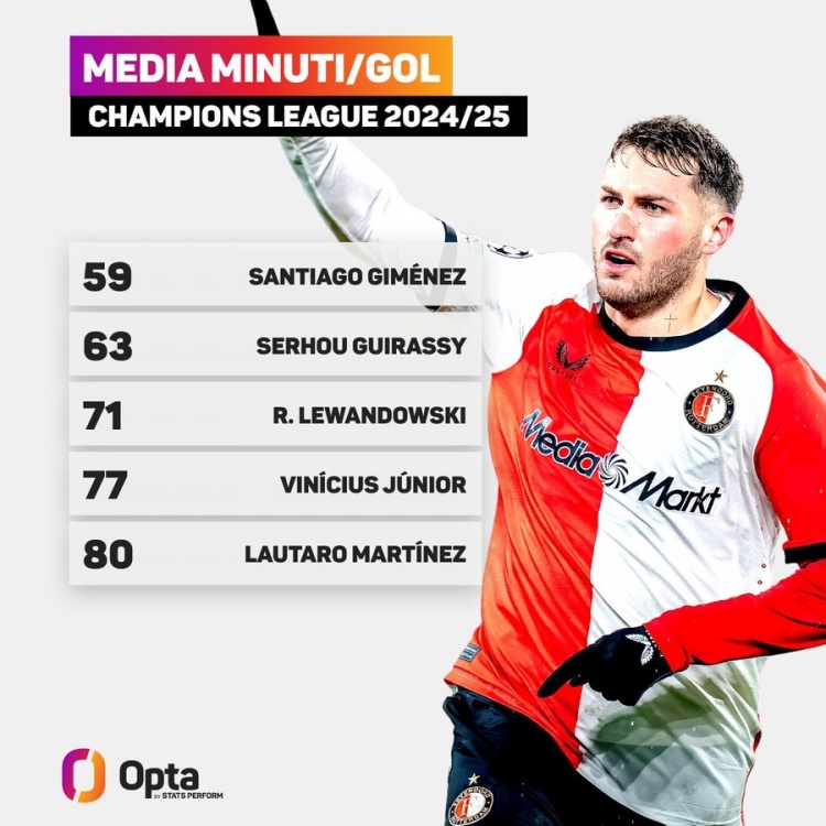 1月31日訊 米蘭當(dāng)前正在求購(gòu)費(fèi)耶諾德中鋒圣地亞哥-希門尼斯,數(shù)據(jù)統(tǒng)計(jì)顯示后者也是本賽季歐冠效率最高的射手。