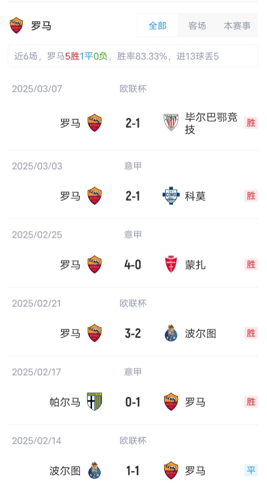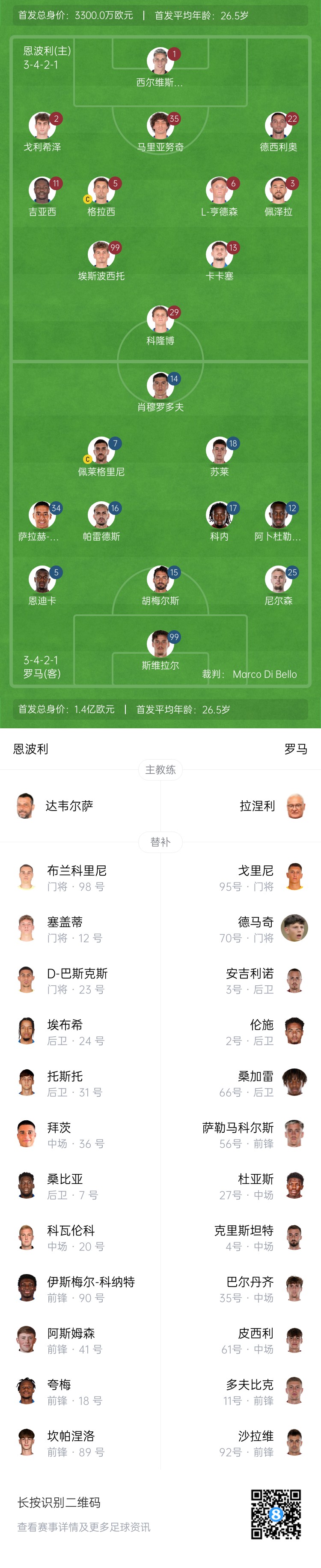 羅馬首發(fā):99-斯維拉爾、25-尼爾森、15-胡梅爾斯、5-恩迪卡、12-阿卜杜勒哈米德、17-科內、16-帕雷德斯、34-薩拉赫-埃丁、7-佩萊格里尼、18-蘇萊、14-肖穆羅多夫