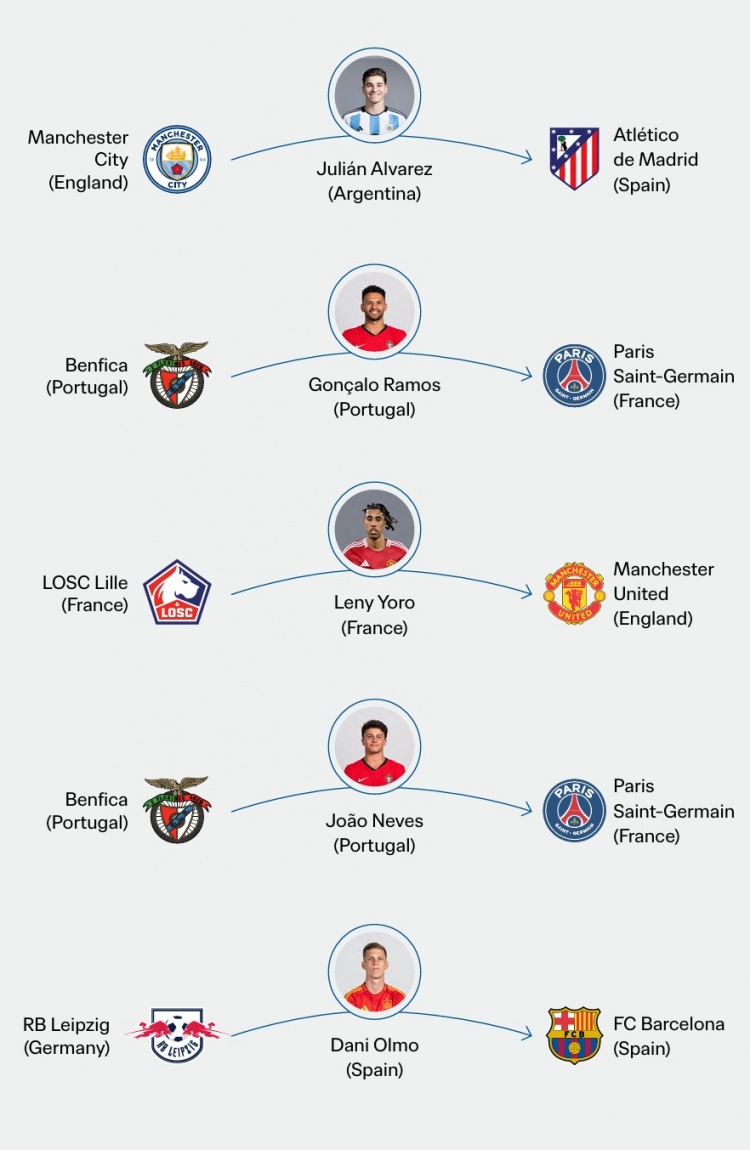 24年球員轉(zhuǎn)會(huì)費(fèi)排行:小蜘蛛7500萬(wàn)歐標(biāo)王,G-拉莫斯&約羅二三位