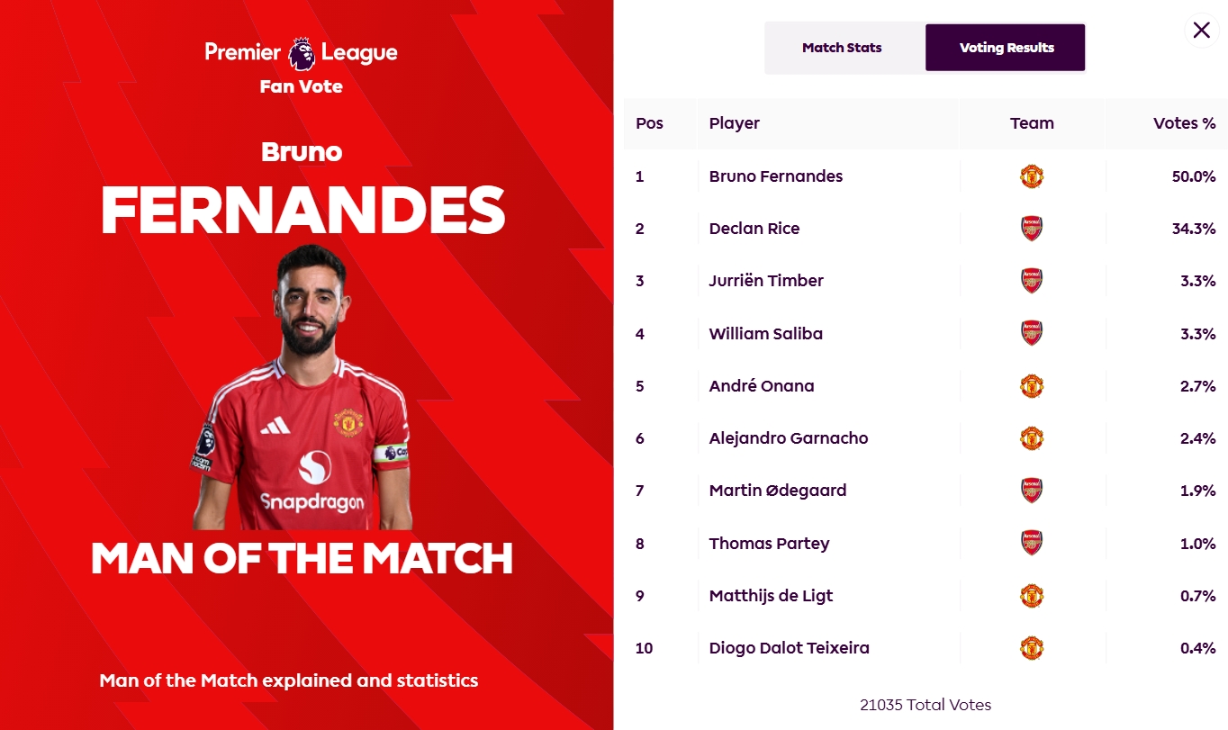 3月10日訊 今天凌晨,曼聯(lián)在英超主場1-1戰(zhàn)平阿森納,賽后曼聯(lián)隊(duì)長B費(fèi)被評為全場最佳。本場比賽,B費(fèi)打入一個(gè)任意球世界波,為曼聯(lián)首開記錄,賽后他獲得50%的票數(shù),被評為全場最佳。 本文標(biāo)簽: 足球 英超 曼聯(lián) B費(fèi)
