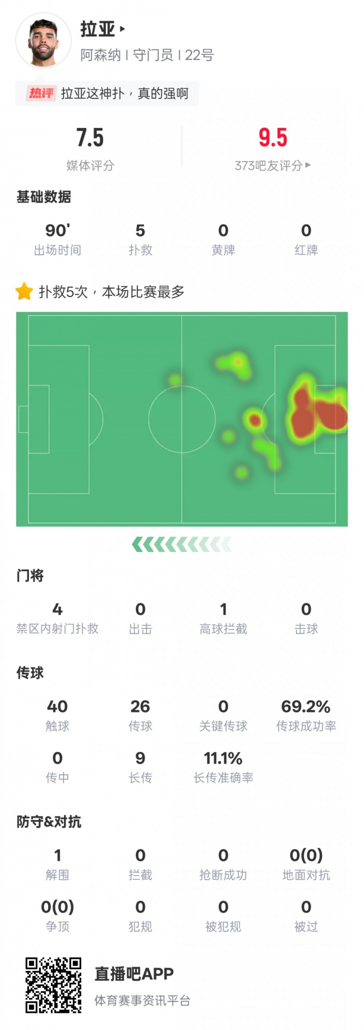 3月10日訊 英超第28輪,阿森納1-1曼聯,拉亞首發(fā)出戰(zhàn),貢獻全場最多的5次撲救,其中有4次是撲救對手禁區(qū)內的射門,他還有1次高球攔截,評分7.5。拉亞本場比賽數據如下:撲救5禁區(qū)內射門撲救4高球攔截1觸球40傳球26傳球成功率69.2%長傳9長傳準確率11.1%解圍1 本文標簽: 足球 英超 阿森納