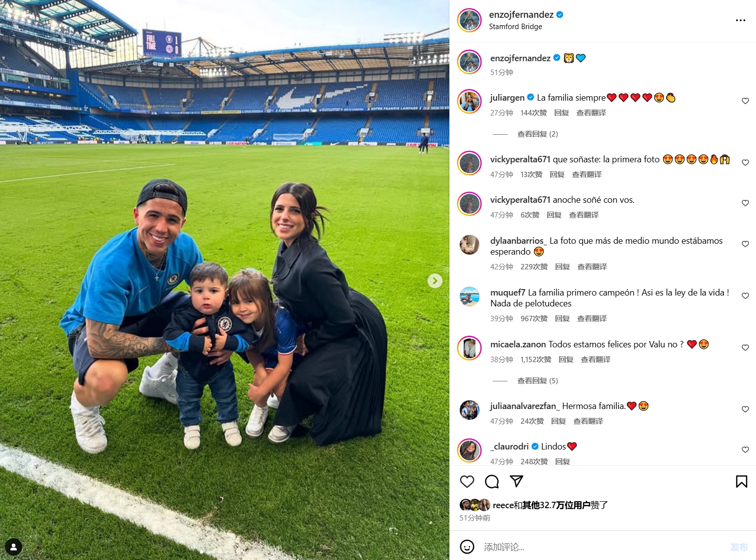 3月10日訊 切爾西中場(chǎng)恩佐今天在Instagram發(fā)動(dòng)態(tài),曬出自己與女友瓦倫蒂娜以及兩個(gè)孩子的照片。此前恩佐曾與瓦倫蒂娜分居,但隨后兩人又重新在一起,今天,恩佐就曬出了兩人與倆孩子在切爾西主場(chǎng)的合照,看起來滿臉幸福。 本文標(biāo)簽: 足球 英超 切爾西