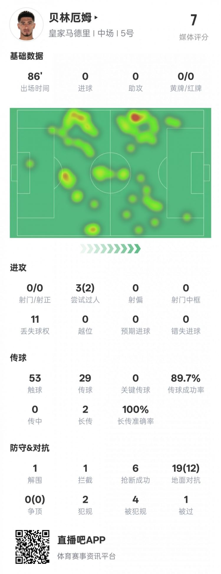3月10日訊 西甲第27輪,皇馬對陣巴列卡諾,貝林厄姆首發(fā)出戰(zhàn),2次過人成功,12次地面對抗成功,還有6次搶斷,評分7.0。貝林厄姆本場比賽數(shù)據(jù)如下:進球0助攻0過人3過人成功2丟失球權(quán)11觸球53傳球29傳球成功率89.7%長傳2長傳準(zhǔn)確率100%解圍1攔截1搶斷6地面對抗19地面對抗成功12犯規(guī)2被犯規(guī)4被過1 本文標(biāo)簽: 足球 西甲 皇家馬德里 貝林厄姆