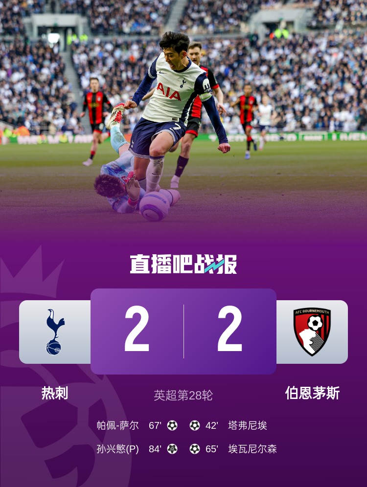 熱刺2-2戰(zhàn)平伯恩茅斯,薩爾、孫興慜破門(mén),熱刺未能主場(chǎng)全取3分。