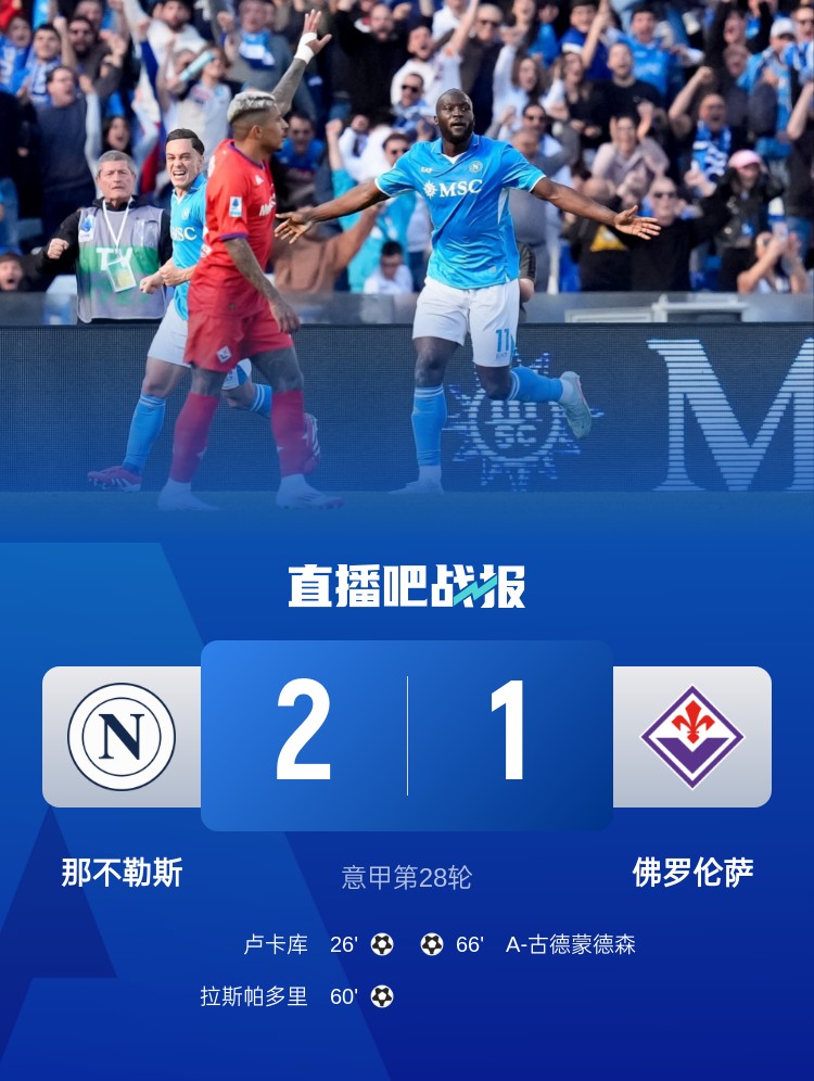 那不勒斯2-1擊敗佛羅倫薩,取得近6輪首勝,盧卡庫(kù)、拉斯帕多里破門(mén)。