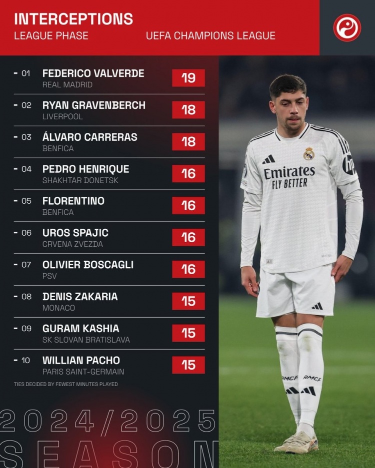 本賽季歐冠攔截榜:巴爾韋德居首,赫拉芬貝赫、A費(fèi)在列