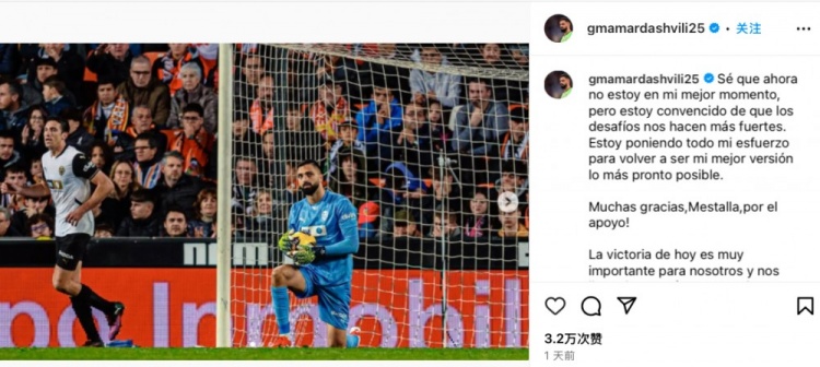 3月10日訊 西甲第27輪,瓦倫西亞2比1戰(zhàn)勝巴拉多利德,比賽第40分鐘,瓦倫西亞門將瑪瑪達什維利出球被斷,導致球隊一度被扳平。賽后瑪瑪達什維利更新社媒致歉,他寫道:“我清楚自己目前并不在最佳狀態(tài),但是困難會讓人變得更加堅強,接下來我會盡我所能拿出最佳水平。非常感謝梅斯塔利亞球迷們的支持!這場勝利非常重要,并且讓我們打起干勁繼續(xù)應對之后的每一場比賽。繼續(xù)前進!” 本文標簽: 足球 西甲 瓦倫西亞 巴拉多利德