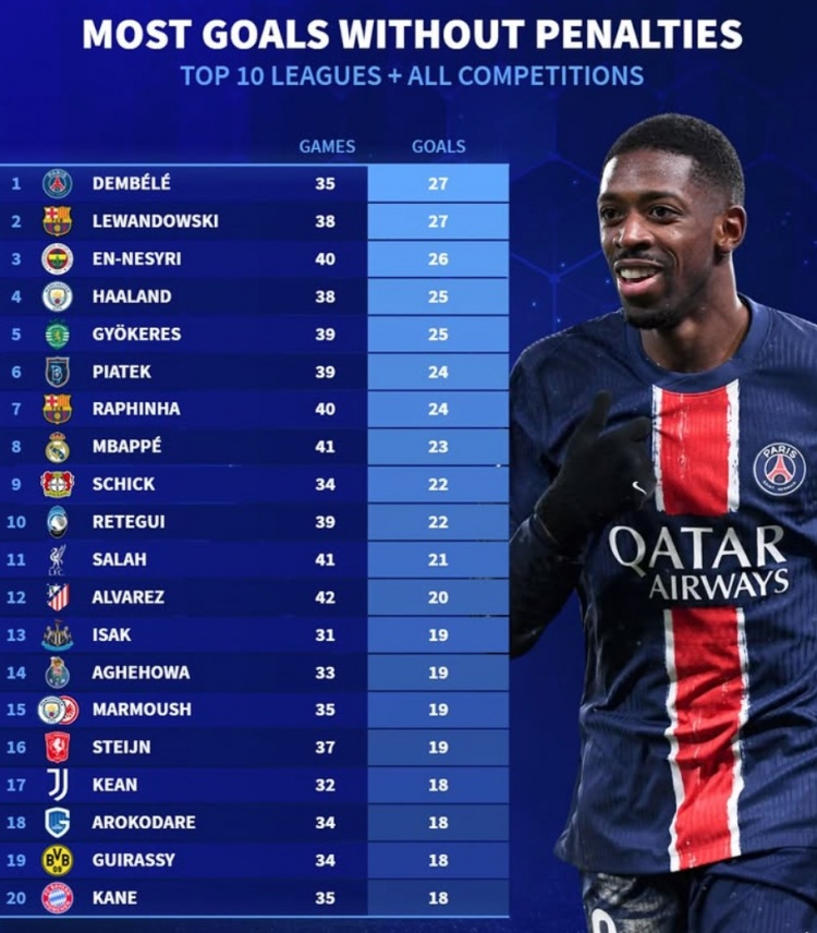 3月10日訊 《轉(zhuǎn)會(huì)市場(chǎng)》統(tǒng)計(jì)了本賽季歐足聯(lián)排名前十聯(lián)賽,并列出了各項(xiàng)賽事的不計(jì)入點(diǎn)球的射手榜情況,登貝萊和萊萬(wàn)均打進(jìn)27球。