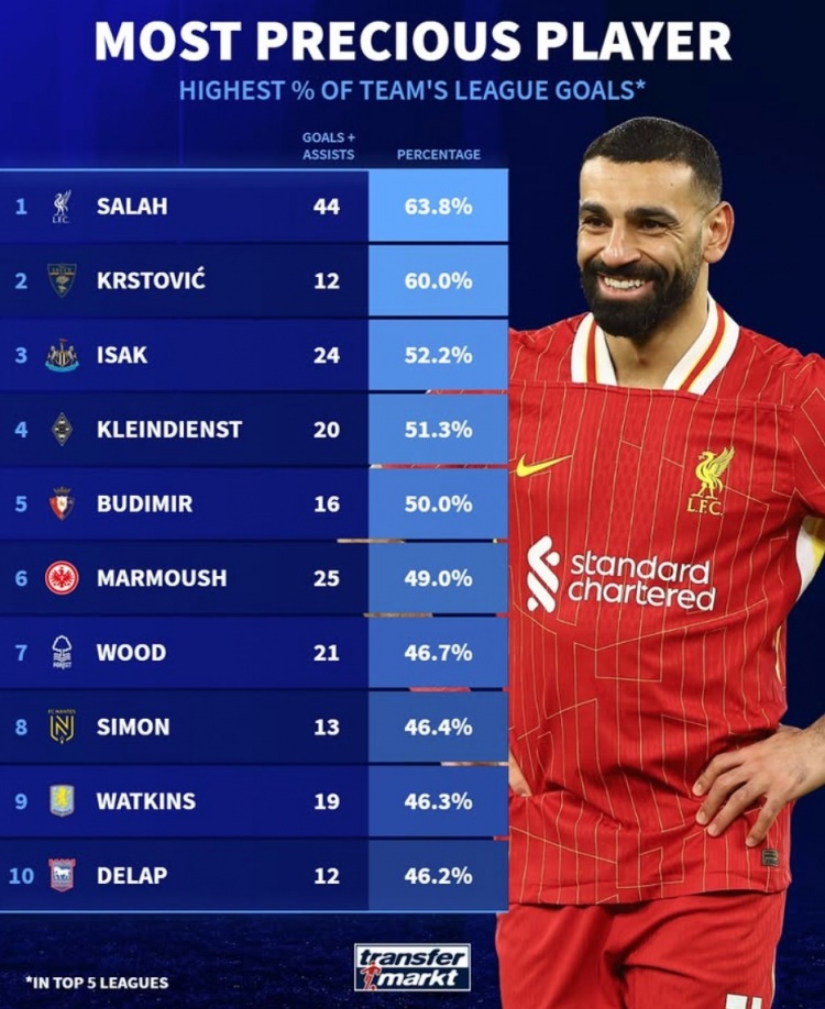 3月11日訊 《轉(zhuǎn)會市場》統(tǒng)計了本賽季五大聯(lián)賽直接參與進球占全隊總進球的比率情況,薩拉赫無懸念居首,已經(jīng)轉(zhuǎn)會曼城的馬爾穆什依然是法蘭克福隊內(nèi)最高。