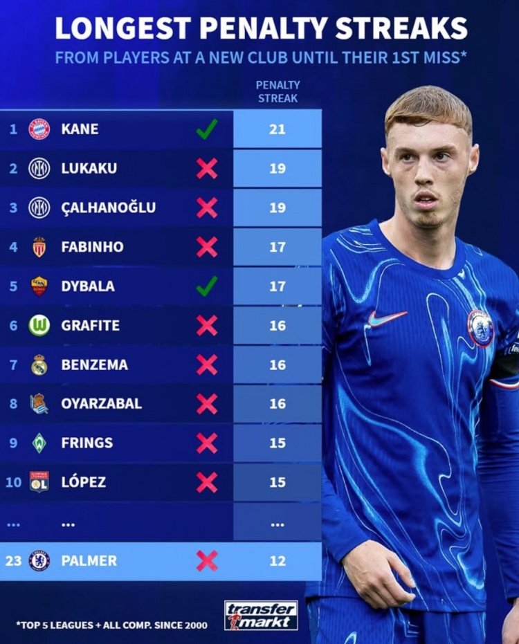 《轉(zhuǎn)會市場》統(tǒng)計了新世紀以來五大聯(lián)賽球員在新東家在不罰丟情況下連續(xù)命中點球紀錄,凱恩21球居首并且仍未罰丟。