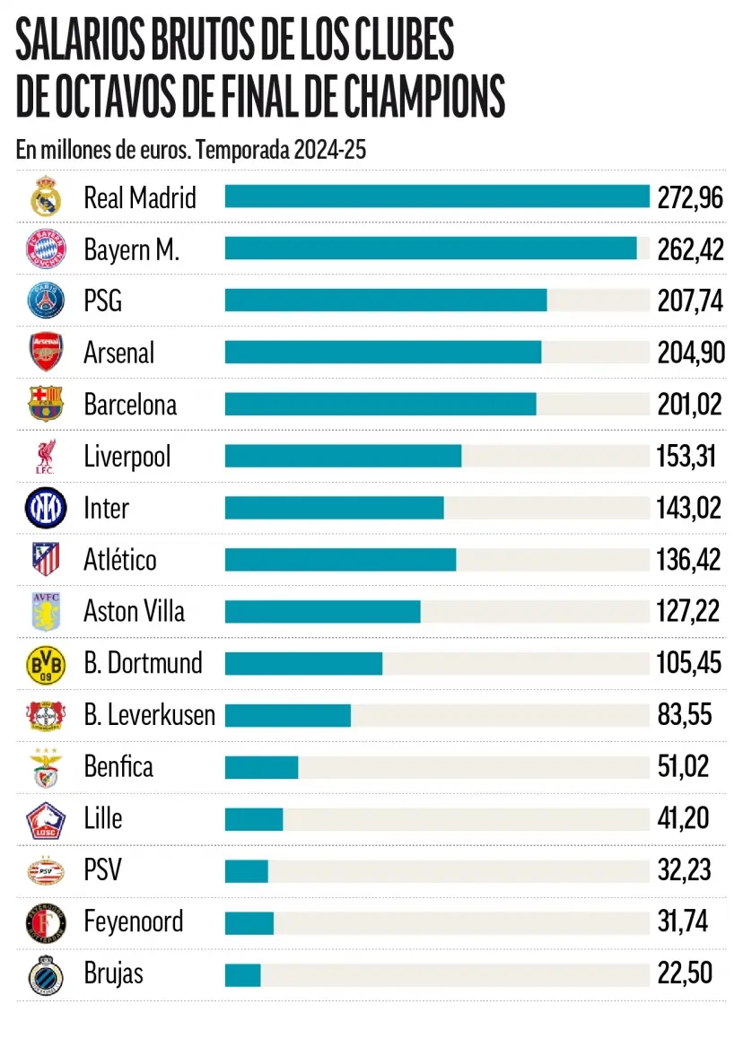 盡管經(jīng)濟實力并不一定保證競技成功——過去十年曼聯(lián)便是例證——但財務差距顯而易見。八強俱樂部的平均年薪支出為1.298億歐元,但最高支出者皇馬(2.729億歐元)與最低支出者布魯日(2250萬歐元)之間的差距達到12比1。