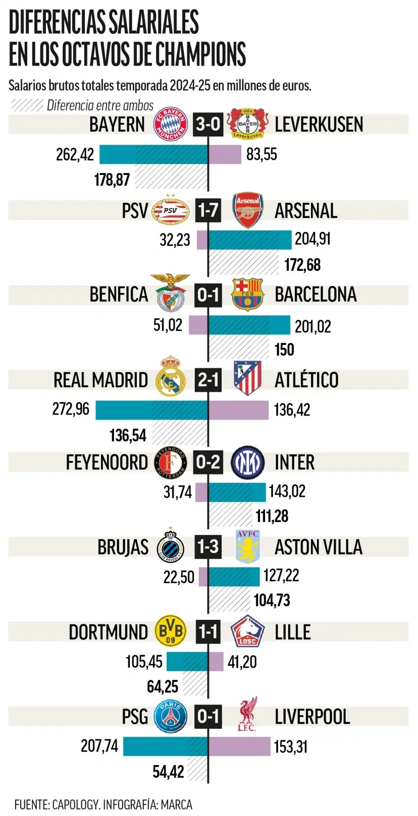 根據(jù)足球財務專業(yè)網(wǎng)站Capology的數(shù)據(jù),如果以球員薪資支出為標準,最不平衡的淘汰賽是對陣拜仁和勒沃庫森的比賽,拜仁的薪資支出幾乎是對手的三倍(2.624億歐元對8350萬歐元)。第二大差距出現(xiàn)在阿森納與埃因霍溫的對決中,阿森納球員的2.049億歐元薪資遠超埃因霍溫的3220萬歐元,差距高達六倍。第三個薪資差距較大的對決是本菲卡與巴塞羅那,巴薩球員的薪水是葡萄牙球隊的四倍(2.01億歐元對5100萬歐元)?;蜀R與馬競的陣容薪資差距恰好是兩倍,皇馬為2.729億歐元,馬競為1.364億歐元。