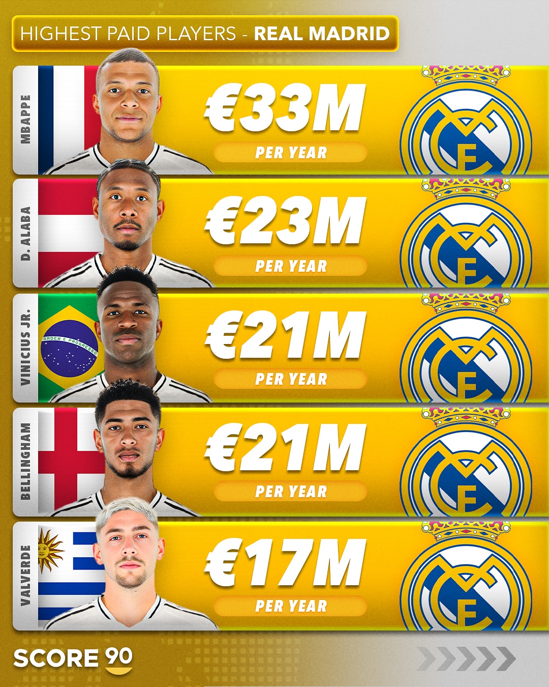 皇馬隊(duì)內(nèi)年薪前五:(單位/歐元)1-姆巴佩,3300萬(wàn)2-阿拉巴,2300萬(wàn)3-維尼修斯,2100萬(wàn)4-貝林厄姆,2100萬(wàn)5-巴爾韋德,1700萬(wàn) 本文標(biāo)簽: 足球 西甲 皇家馬德里 姆巴佩 貝林厄姆