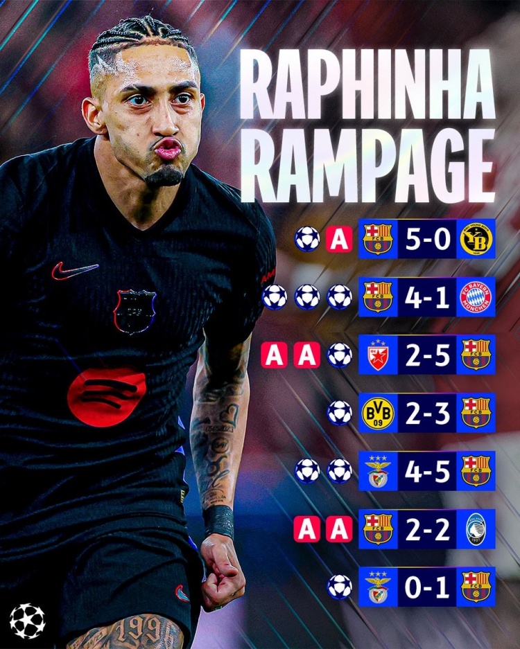 歐冠官方數(shù)據(jù)統(tǒng)計(jì)顯示,拉菲尼亞本賽季在9場(chǎng)歐冠有7場(chǎng)能夠直接參與進(jìn)球,貢獻(xiàn)9球5助攻: